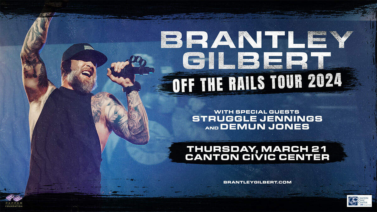 Brantley Gilbert brings his Off The Rails Tour 2024 to the Canton Civic Center on Thursday, March 21 at 7:00PM! Joining the show, special guests: Struggle Jennings and Demun Jones! For complete show details and to purchase your tickets, click HERE! Listen to Brantley Gilbert on iHeartRadio!