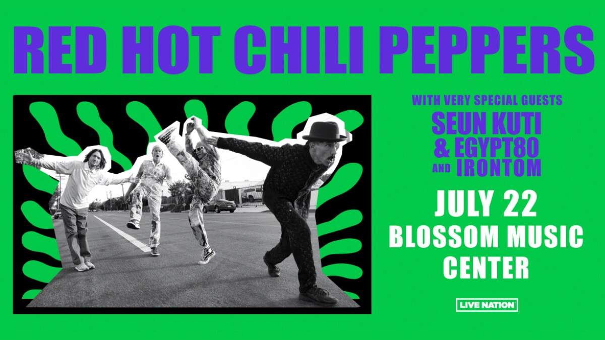 Red Hot Chili Peppers brings their Unlimited Love 2024 Tour to Blossom Music Center on Monday, July 22 with special guest: Seun Kuti & Egypt80 and IronTom! For complete show details and to purchase your tickets, click HERE!