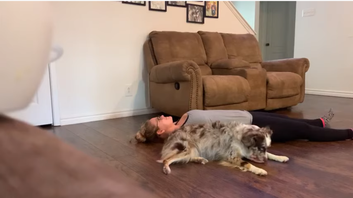 This woman sprawls out on the ground to pretend to pass out and gets immediate attention from her pup as it rushes over to make sure she is okay and lays there until she gets up.