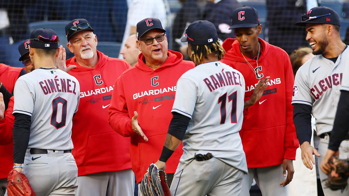 NEW YORK, NEW YORK - OCTOBER 14: Jose Ramirez #11 of the Cleveland Guardians celebrates with manager Terry Francona after defeating the New York Yankees 4-2 in ten innings in game two of the American League Division Series at Yankee Stadium on October 14, 2022 in New York, New York.Photo: Elsa/Getty Images